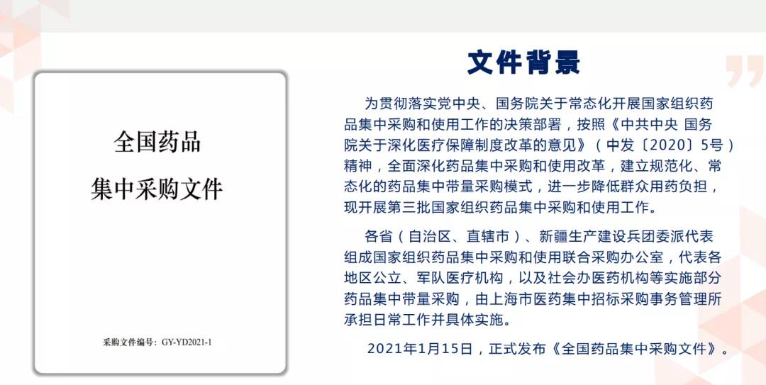 今日(1月25日),國家聯(lián)采辦再次發(fā)文,為做好集采解讀工作,企業(yè)可登陸“國家組織藥品集中采購綜合服務(wù)平臺”,下載《全國藥品集中采購文件要點解讀》進(jìn)行學(xué)習(xí)。網(wǎng)址為:http://pub.smpaa.cn/xxsj。